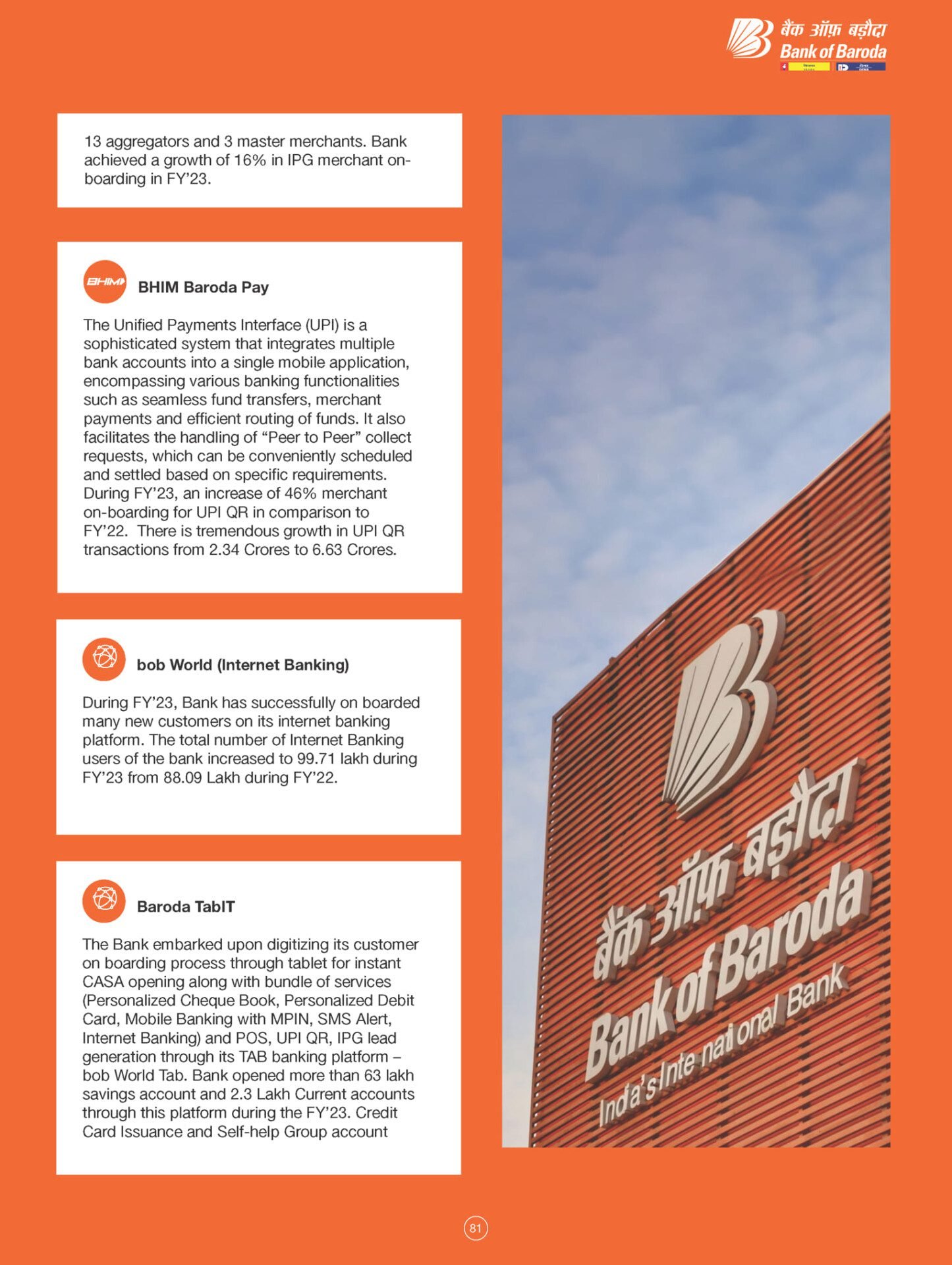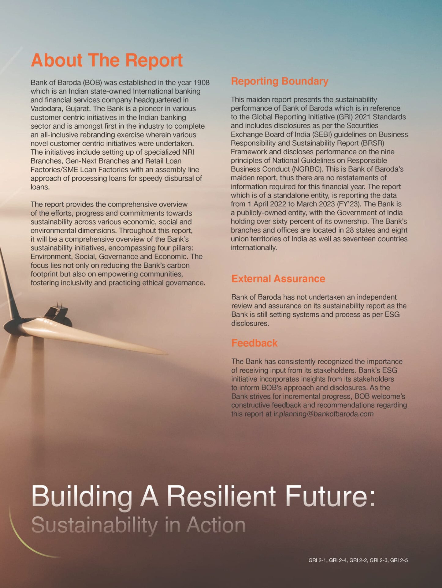 Bank of Baroda Sustainability Report 2022-2023 Bank of Baroda Sustainability Report 2022-2023 Client Bank of BarodaDomain Banking & FinanceService Sustainability Report Previous Navin Fluorine Sustainability Report 2022-2023 Next Birla Estates Sustainability Report 2023–2024 Date: 06/03/2024 Client : Bank of Baroda Domain : Banking & Finance Service : Sustainability Report Share on